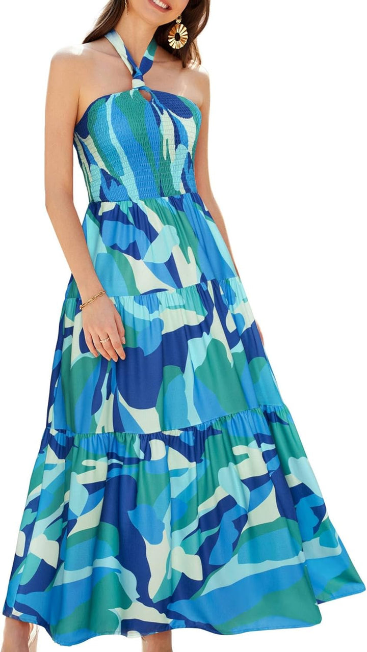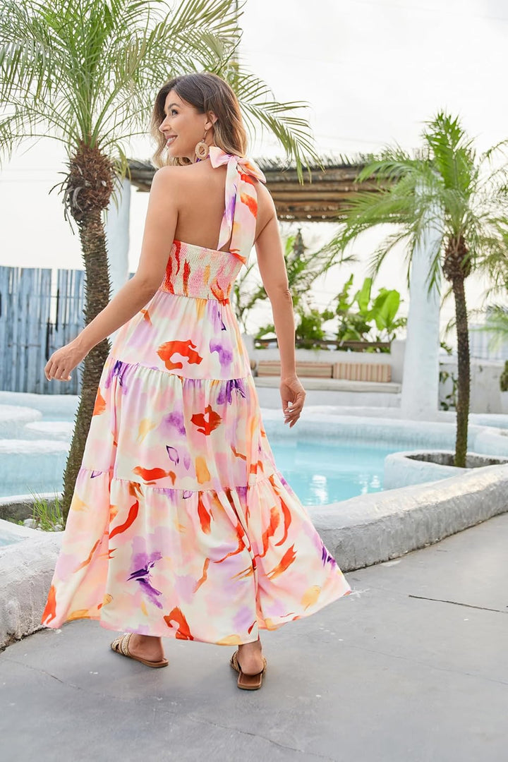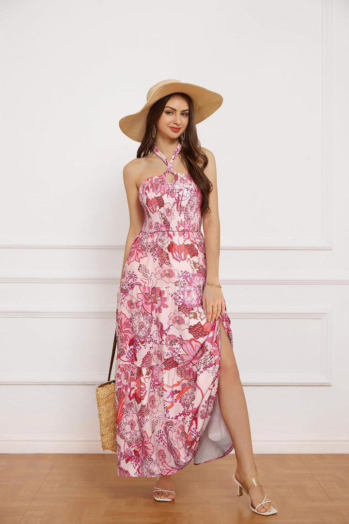 GRACE KARIN Women's Summer Dresses 2025 Halter Neck Sleeveless Smocked Backless Cut Out Floral Flowy A Line Maxi Dress