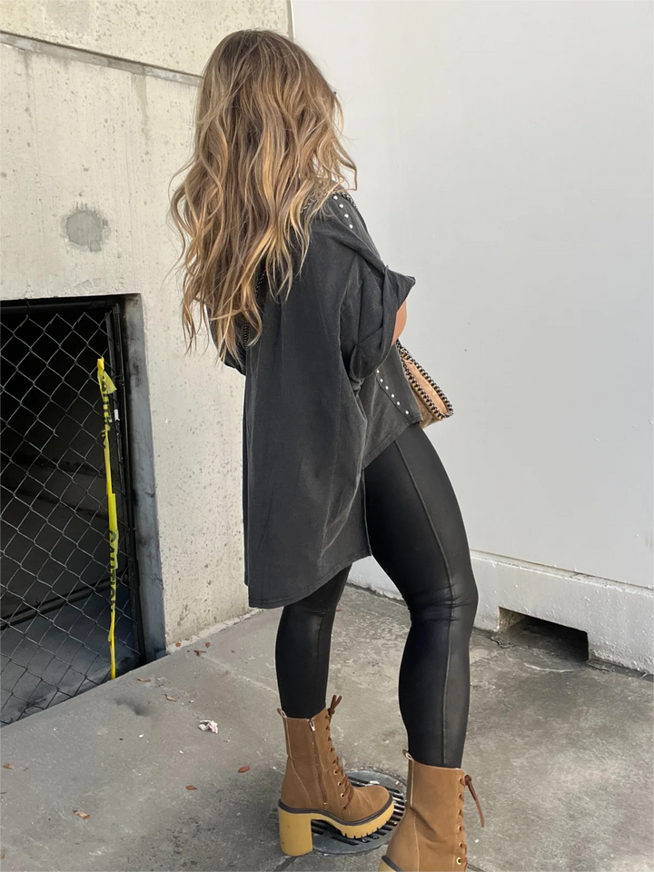 Add a little edge to your wardrobe with this oversized tee featuring stud details and a high-low hem. Easily dress it up with a pair of leather leggings or distressed skinny jeans + a chunky boot!