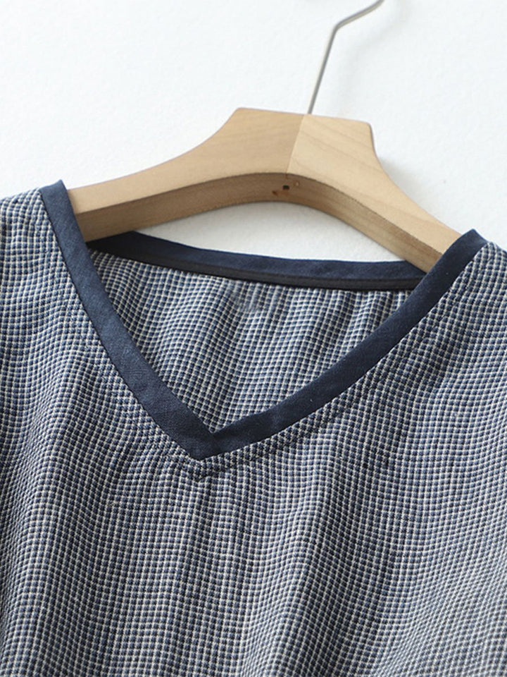 Women's Literary Retro V-neck Plaid Tie Mid-sleeve Dress